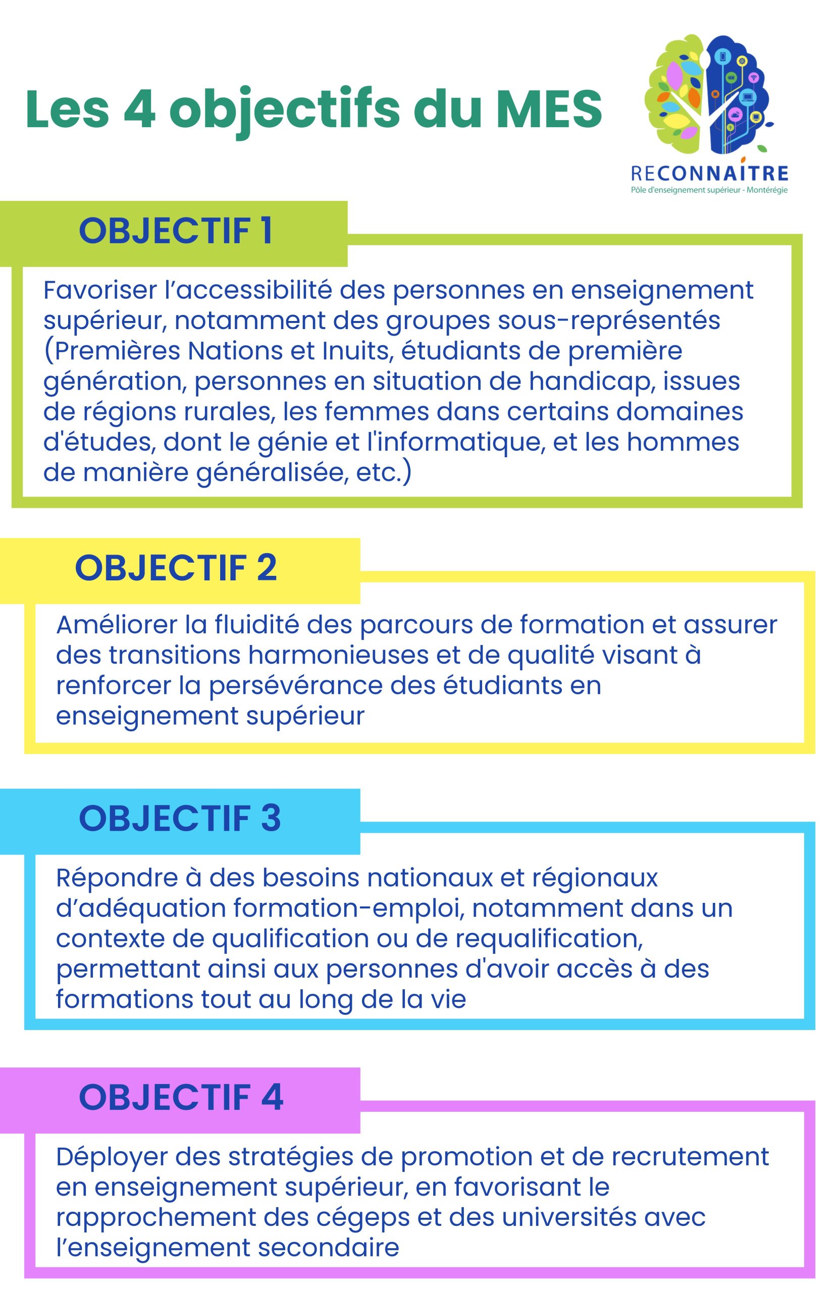 Afin de soutenir la concertation entre les établissements collégiaux, universitaires et les acteurs socio-économiques, le ministère de l’enseignement supérieur a mis sur pied dans chaque région administrative un pôle de concertation interordres. RECONNAITRE est le pôle de la Montérégie.